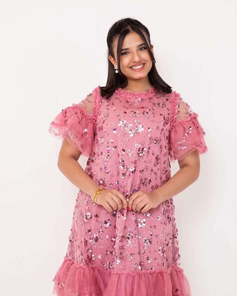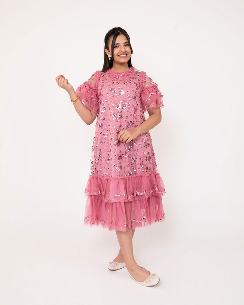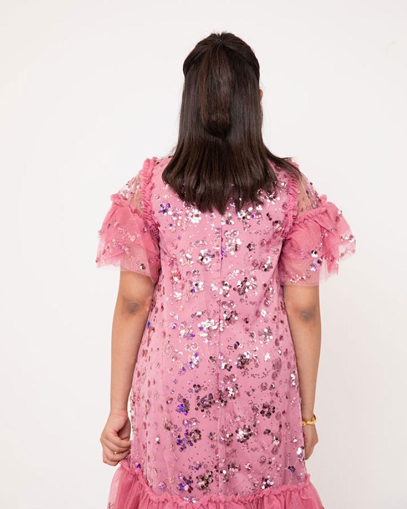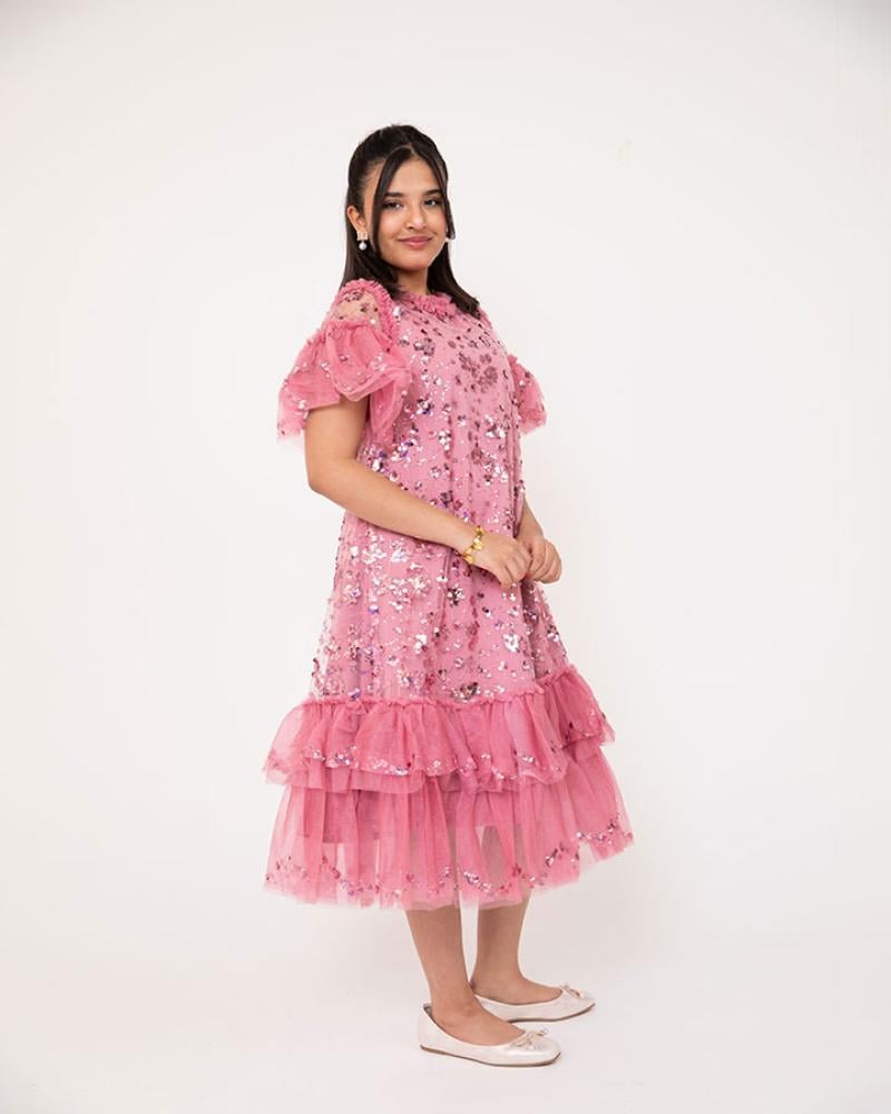 فستان باللون الفوشي مطرز بالترتر الفوشي